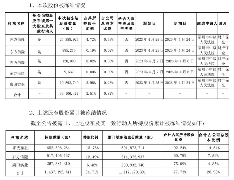 5月11日,ST阳光城披露的《关于股东部分股份冻结的公告》显示,控股股东及其一致行动人所持有ST阳光城的股份被大规模冻结。其中,东方信隆资产管理有限公司(简称“东方信隆”)、福建康田实业集团有限公司(简称“康田实业”)在2023年4月至2026年4月期间合计被冻结3610.65万股。