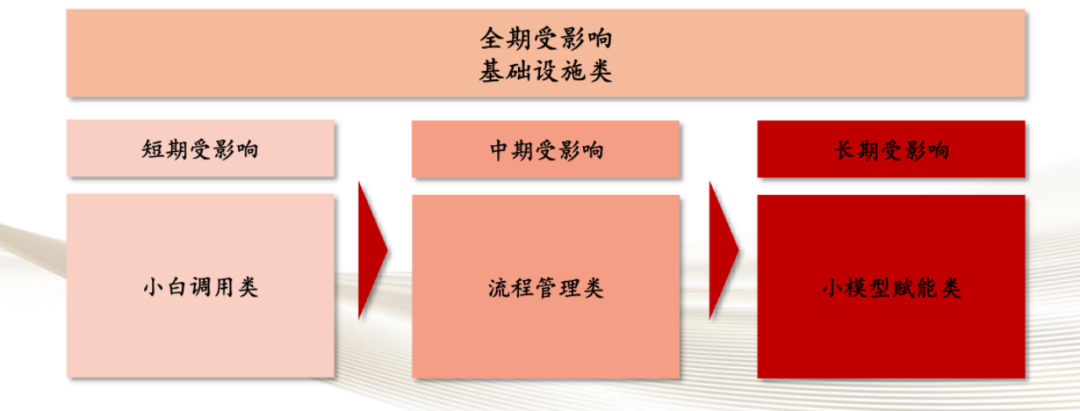 针对第一个论点,华西证券对可能受到GPT影响的公司进行了详细地分析,将它们分为四类:基础设施类、小白调用类、流程管理类、小模型赋能类。这些公司在AI技术,特别是GPT的影响下,将面临不同的挑战和机遇。