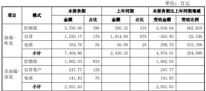 新消费财研社了解到,在2022年青海春天高端酒产品听花酒的销售中,经销商渠道占比达到了78%,同比大增662.81%,自营收入占比17%,同比减少约23%。电商销售增幅虽然高达533%,但是总体占比只有5%。