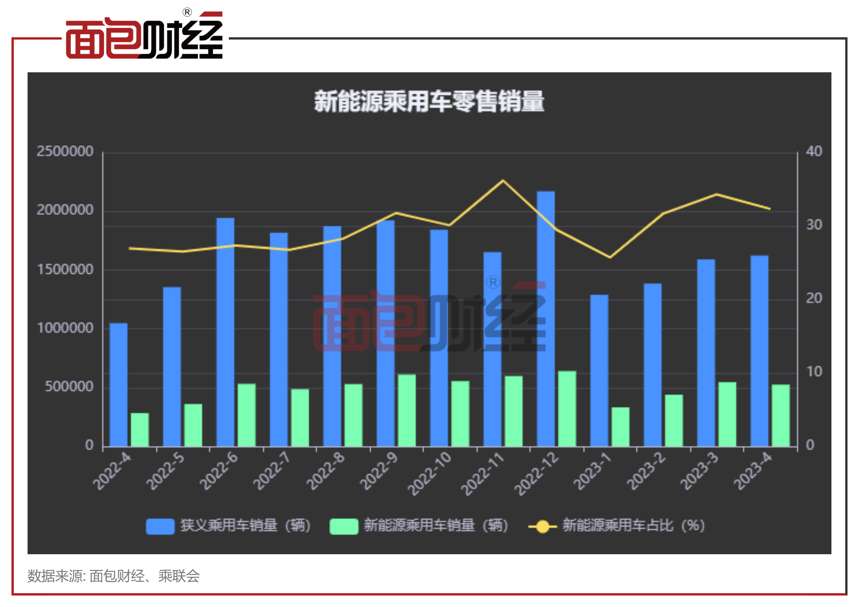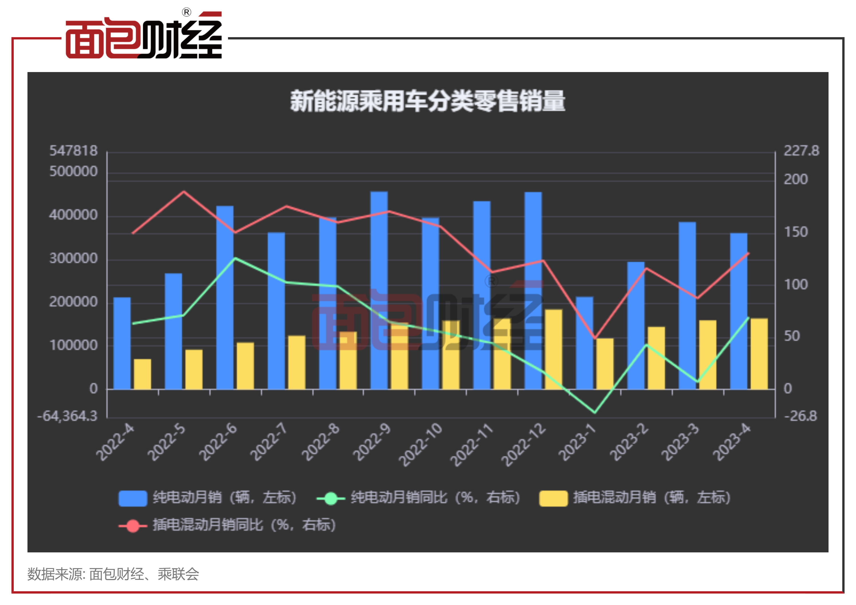 根据乘联会披露的零售数据统计,2023年4月,国内新能源乘用车销量达到52.47万辆,占狭义乘用车的32.32%,环比下降1.99个百分点。其中,纯电动车零售销量同比增加69.4%,插电混动车同比增加131.1%,继续保持正增长。