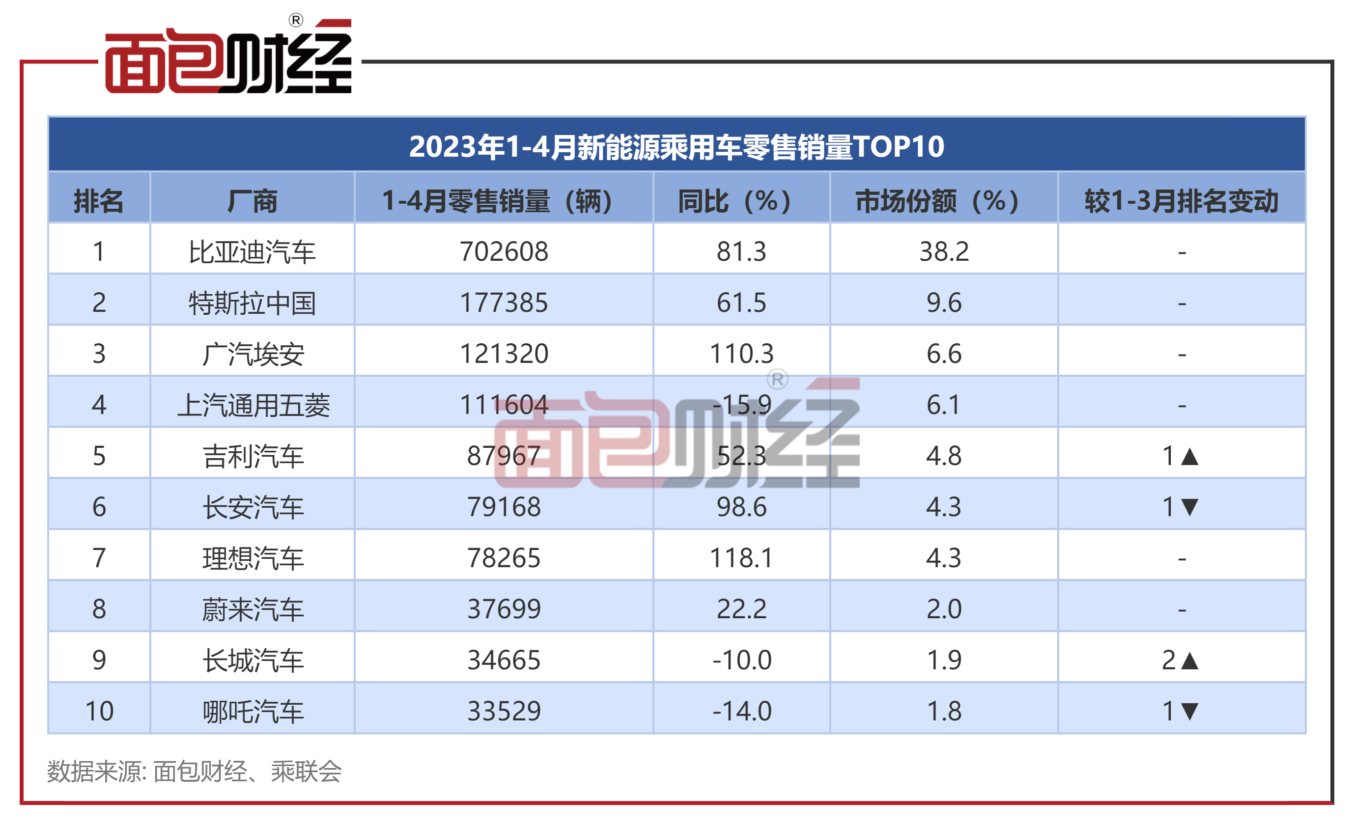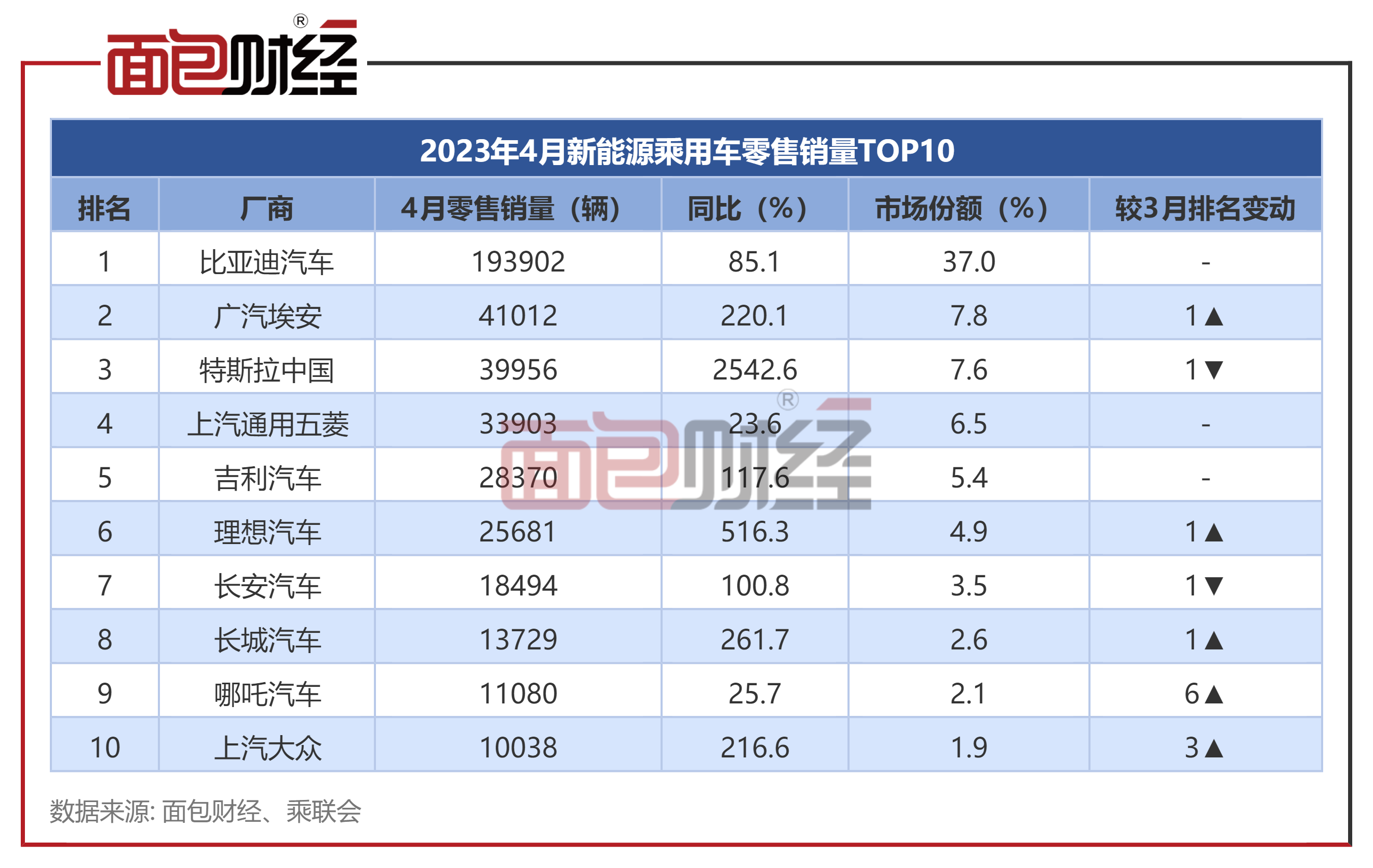 2023年4月,比亚迪汽车的月销量位居新能源乘用车销售榜第一,达到19.39万辆,广汽埃安、特斯拉中国的月销量在4万辆左右。其中,蔚来汽车、小鹏汽车已跌出TOP10榜单。