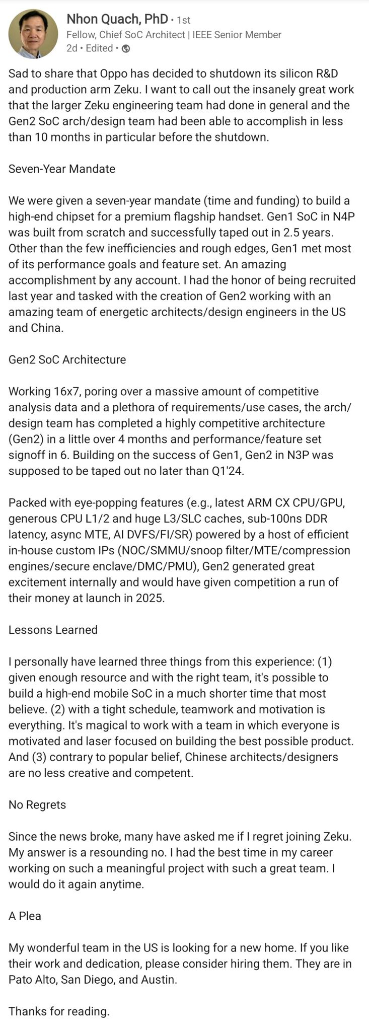 根据前哲库首席架构师 Nhon Quach 在 Linkedin 上发布的消息称,哲库的目标是搭载 5G 基带的 SoC,将在 2024 年年初流片生产,这将会是哲库第一代顶级芯片,然后用三年的时间去做三代 SoC 的迭代,最终达到预设目标 —— 一颗业界领先水平的 SoC 芯片。