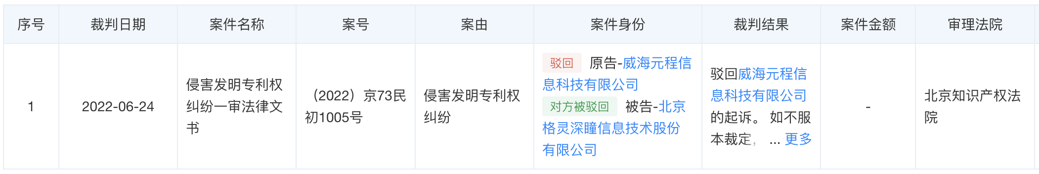天眼查显示,2022年6月,格灵深瞳与威海元程信息科技有限公司(简称“威海元程”)有一起侵害发明专利权纠纷,该案件中威海元程因同一案件重复上诉被北京知识产权法院裁定驳回,但此前于2022年5月26日的案号为“(2022)京73民初986号”侵害发明专利权纠纷起诉已被受理。