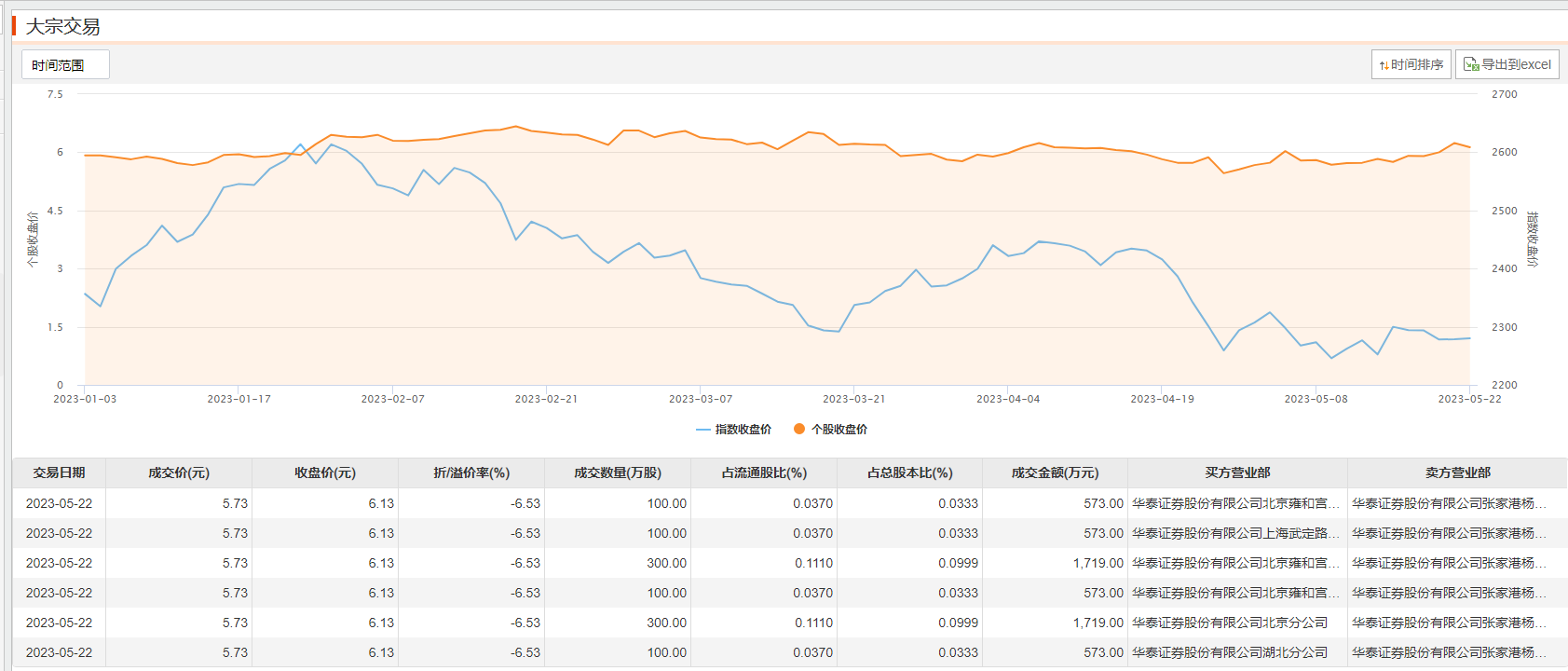 红日药业5月22日大宗交易成交1000万股,成交额5730万元,占当日总成交额的11.38%,成交价5.73元,较市场收盘价6.13元折价6.53%。