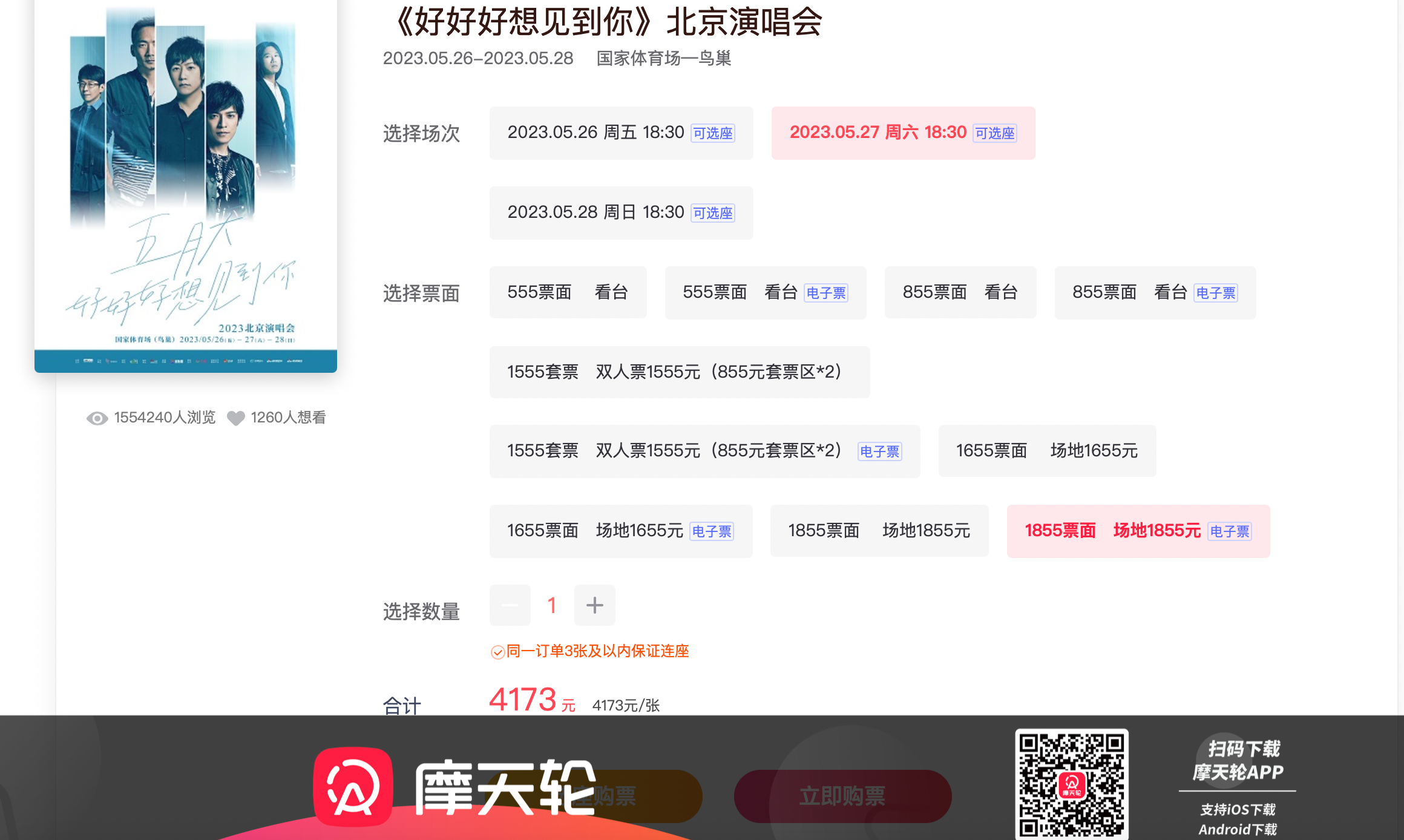 首先,开5万人以上大场的演唱会歌手不多。周杰伦、五月天是开大场歌手中,票价溢价最高的。票牛、摩天轮上五月天的北京6场演唱会,最高溢价超过了2000元,1855元的票面价卖到了4000多。不止北京演唱会,五月天在深圳的3场演唱会溢价也在两个平台超过1000元。