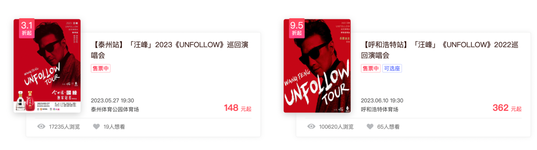 汪峰虽然另辟蹊径选择的是3万人的中场,但仍然是逃不过场场折扣的命运。汪峰的泰州演唱会都在两个平台上3折大甩卖,1880元的内场票只要900元左右,480元的票甚至只要149元。