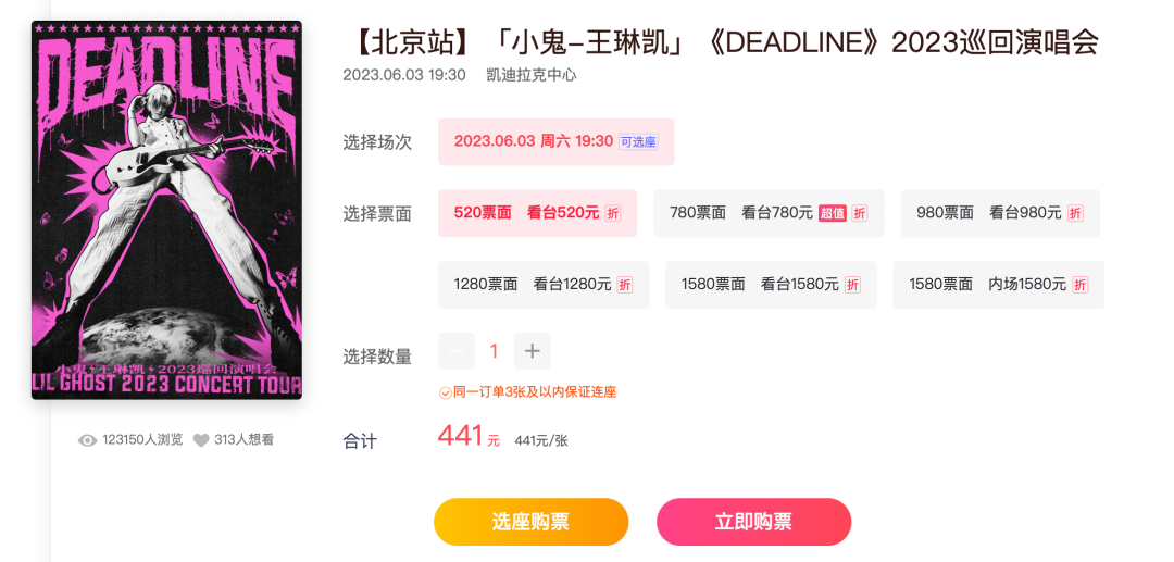 一代新人换旧人,选秀出道的后辈们票务状况都要略好些。比如,《偶像练习生》男团NINE PERCENT出道的“小鬼”王琳凯,他的北京、南京两场演唱会票价都出现了折扣,但折幅也是在300、500元。