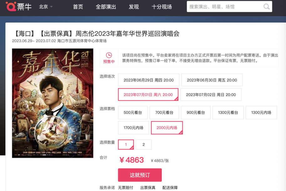 周杰伦太原3场演唱会的溢价和五月天的程度类似,但海口4场演唱会的溢价,令硬糖君大为震惊。两个平台的溢价分别超过了2800、3200元,票价达到了5千多的高价。究其原因,可能因为这场演唱会是延期了三年之久,逐渐演变成了周杰伦和海南富豪之间的约定。