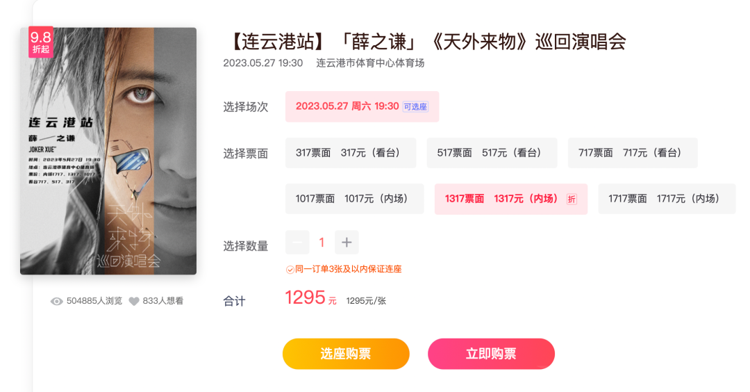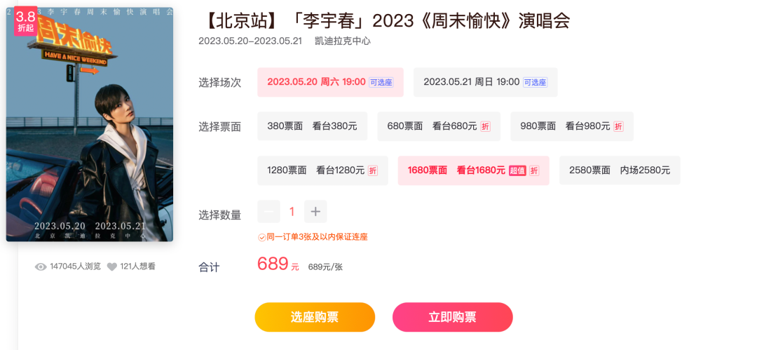 最高的内场票直接降了1000多。因为日期比较临近,硬糖君查看了同一天5月20、21日开演唱会的歌手,折价这么多的情况也非常罕见。