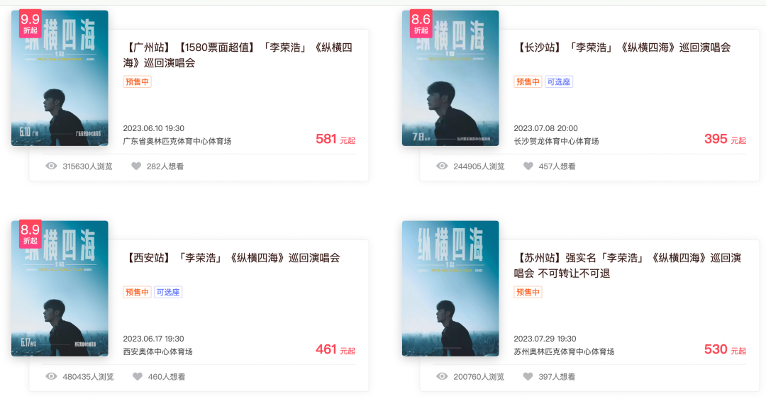 但结果是,李荣浩可能也撑不起大场演唱会,大家在短视频听听就算了。因为他广州、长沙、西安的大场演唱会均出现折扣票,而且折扣幅度超过百元。
