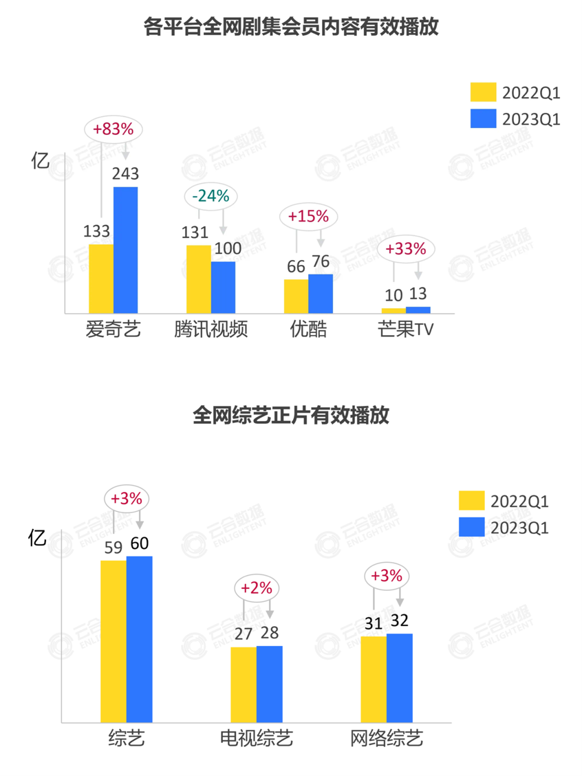 但剧集侧,长视频会员内容正片有效播放同比上涨27%,会员内容有效播放占比同比上涨11%,其中爱奇艺的会员内容有效播放同比上涨83%。