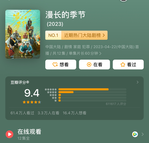 豆瓣评分9.4,评分人数逼近60万。作为近五年豆瓣评分最高的国产剧,《漫长的季节》对腾讯视频的意义不仅是再次自证了平台成熟的内容生产力和运营方法论,也让“X剧场”作为高品质厂牌迅速的被观众铭记,使“晚一步”的腾讯视频在长视频剧场化运营中成功做到了后发制人。