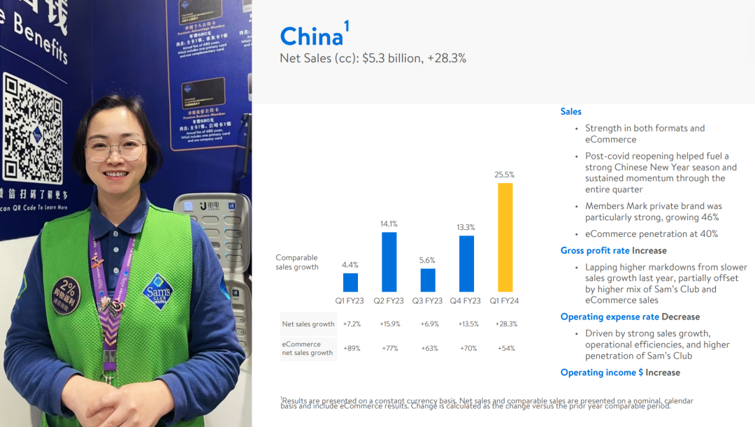 “(在中国,)各业态和渠道的业绩都非常强劲:山姆的会员持续增长,会员留存率更高,大型超市的趋势有所改善,电商的销售额增长超过50%。”他补充说。