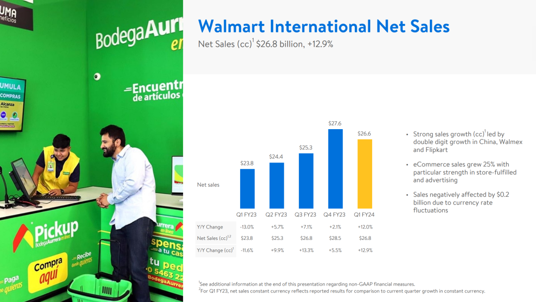 董明伦在会上表示,一季度,沃尔玛的国际市场业务表现出色,延续了去年的势头。按固定汇率计算,该业务的销售额同比增长12.9%,而利润增速更高,达到41%。