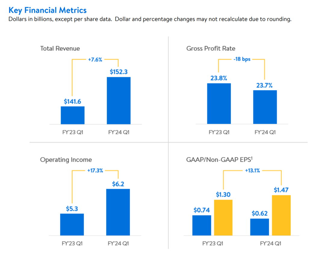 5月18日,这家全球零售巨头公布截至4月30日的2024财年第一季度业绩(注:即第一财季,下称“一季度”)。小食代留意到,其中,沃尔玛中国的净销售额为53亿美元(约合人民币372.49亿元),同比增长28.3%,可比销售额增长25.5%,电商业务净销售额增长54%。