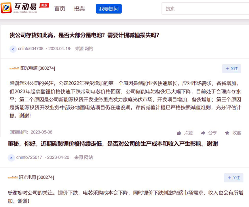 最近,有多位阳光电源的投资者通过深交所互动易平台向公司提问。其中,有投资者担心阳光电源的高额原材料与库存为电池,从而影响到企业未来业绩。对此,公司也都作了回应。