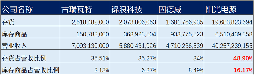 在库存商品占营业收入比例这个指标上,阳光电源与古瑞瓦特差异巨大:古瑞瓦特为2.13%,阳光电源为16.17%,后者是前者的七倍多。同样,阳光电源的库存商品占营收的比例,与固德威、锦浪的差异,也在一倍以上。