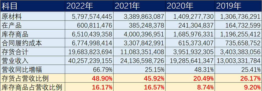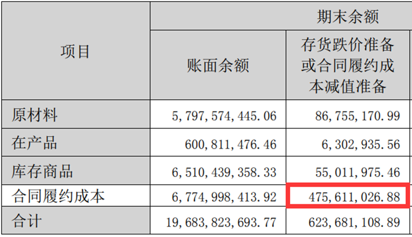 公司在2022年的存货较2021年猛增86个亿,除了“合同履约成本”增加34个亿以外,增加最大的还有两块: