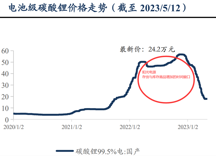 而阳光电源的原材料与库存商品大幅增加的时间段,几乎是“精准”覆盖了2022年高价碳酸锂周期。