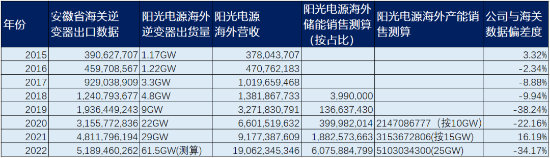 赶碳号对阳光电源自2015年以来至今、总共8个财年的海外营收情况与中国海关出口数据进行了对比。