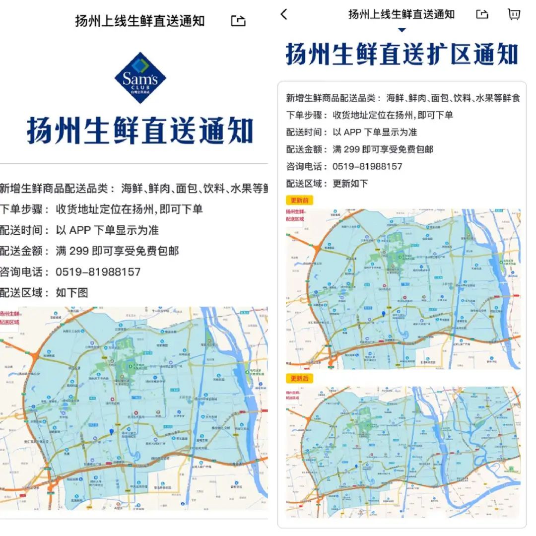 图/山姆开通扬州部分地区的生鲜直送通知,来源/山姆APP 燃次元截图