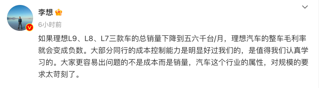 这不,前不久理想汽车CEO李想在自己的微博上发文表示:“如果理想L9、L8、L7三款车的总销量下降到五六千辆/月,理想汽车的整车毛利率就会变成负数。”