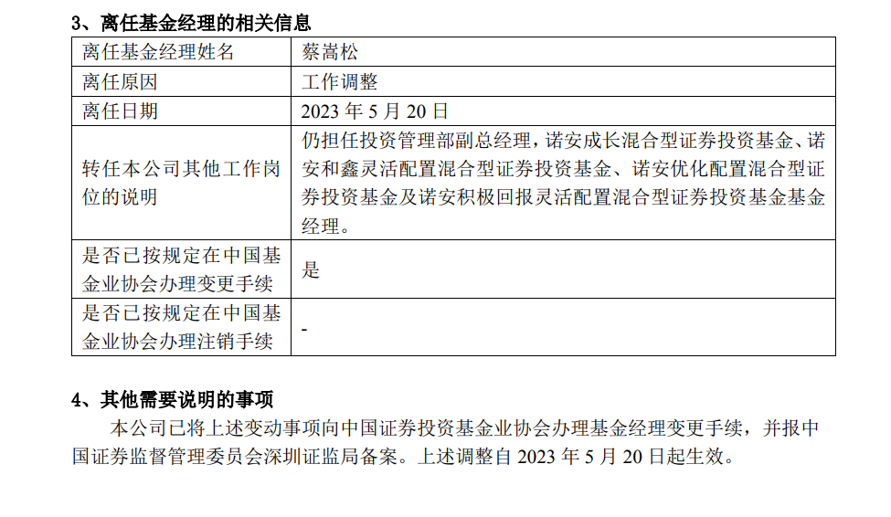 值得注意的是,蔡嵩松似乎在一步步走向幕后。以他的代表作诺安成长混合为例,这只基金在今年2月18日新增了刘慧影为第二基金经理。而早在2022年8月3日,刘慧影也被增聘为诺安优化配置的第二基金经理。