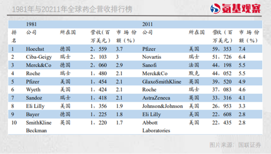 1981年时在全球药物营收前十名排行榜中,欧洲药企占据了七个席位,但到了2011年,榜单中的欧洲药企减少到了四个。