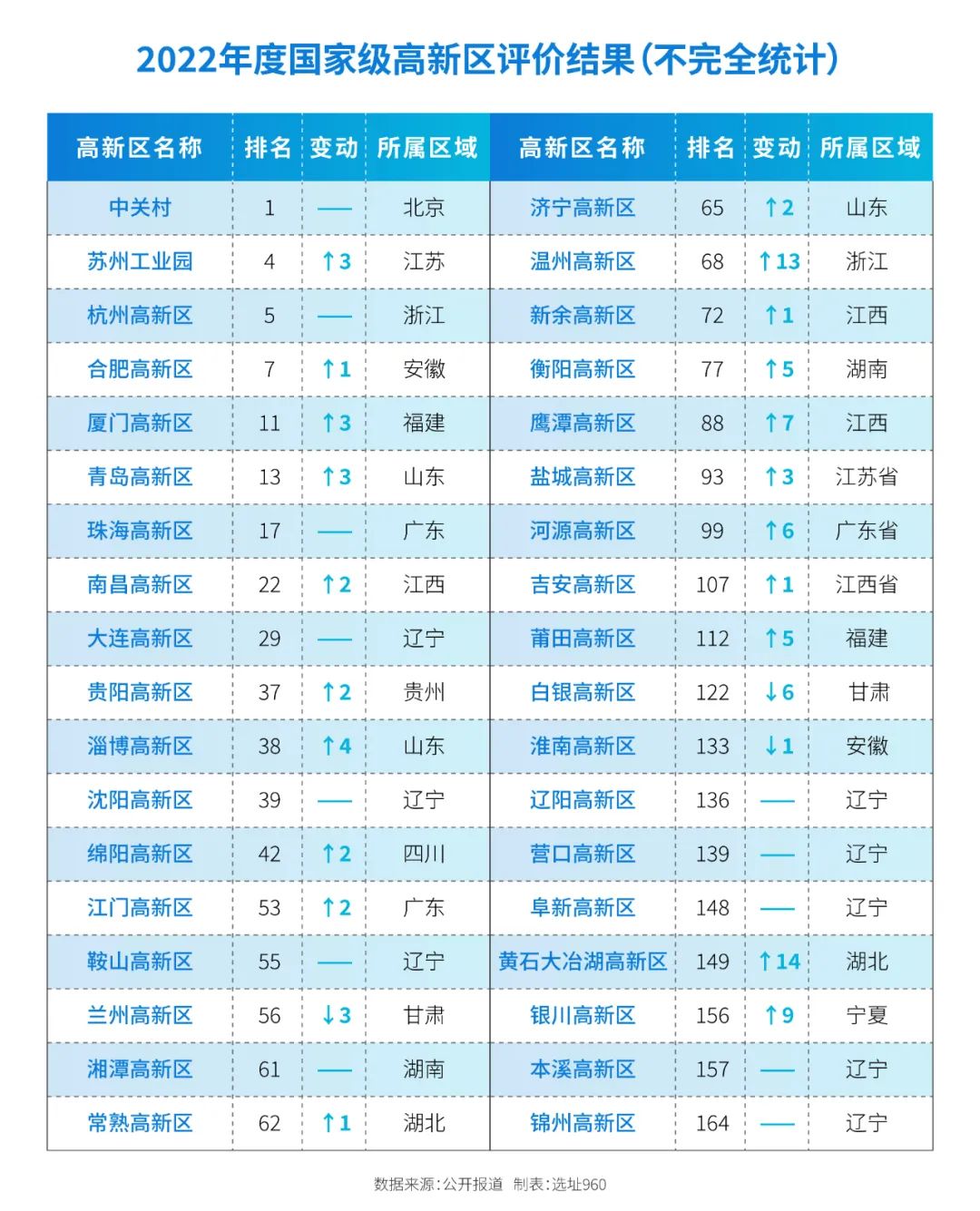 基于公开报道,选址960独家整理了2022年度国家级高新区评价综合排名(不完全统计),为企业选址提供参考。