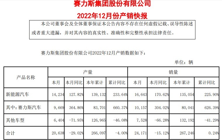 当然,赛力斯集团的新能源车除了乘用车,也有商用车,但无论如何该司整个新能源汽车的销量增速,在2022年是远超行业大盘的。