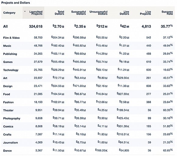 根据KICKSTARTER的官方统计,如果按照这个平台上各领域项目数量排名,排名前列的依次是影视、音乐、出版和游戏领域,接下来才是科技,而后是艺术、设计、饮食和时尚。即使是按照筹资额度来排名,科技依然排在游戏、设计之后。而且很明显的是,科技是其中成功率最低的领域,只有19.6%。