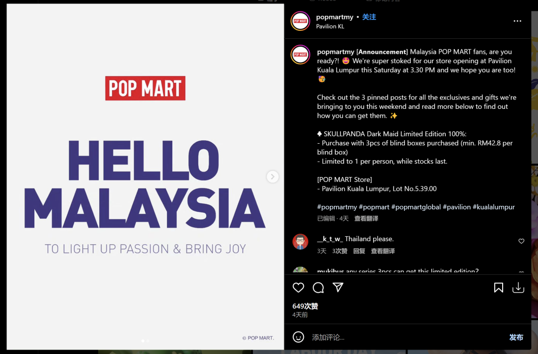 近日,潮流玩具公司泡泡玛特马来西亚首店在吉隆坡Pavilion Kuala Lumpur正式开业,这也是继新加坡之后,泡泡玛特在东南亚开拓的第二个市场。