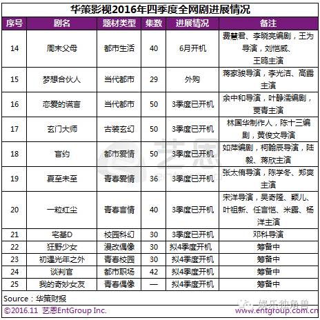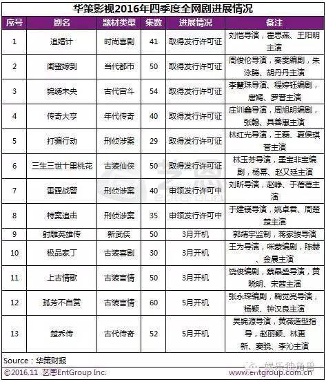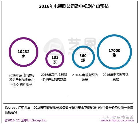 从电视剧行业整体情况来看,今年已有超过10000家企业获得《广播电视节目制作经营许可证》,其中132家为甲种资质。2016年全年生产电视剧产量预计在360部左右,总集数约为17000集,2016年获得发行许可及备案的古装大剧(集数大于等于50集)部数增加或将导致整体平均集数继续增加。