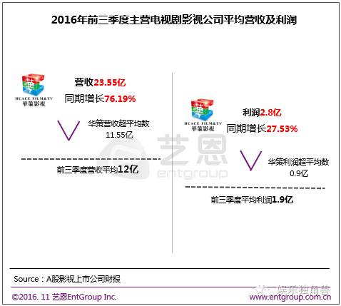 从营收来看,前三季主营电视剧的A股影视上市公司营收均值为12亿元,计有4家公司超过平均线,其中华策影视营收23.55亿元,《解密》、《三生三世十里桃花》、《锦绣未央》等贡献主要收入,为最高营收公司。从净利润来看,前三季主营电视剧的影视上市公司净利润为1.9亿元,仅有2家公司超过平均水平,其中华策净利润2.8亿元。华策影视仍有较多存货,如《孤芳不自赏》、《射雕英雄传》、《传奇大亨》、《盲约》等多部全网剧,预计四季度净利润将有较大增幅。