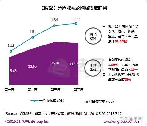 根据监测数据,《解密》全剧平均收视率为1.58%,在同时段电视剧收视率中排名第一;同时,截至10月底,《解密》在各大主流视频网站上的点播量也已累计达61.59亿,全网表现突出。华策在《解密》制作过程中,将原著小说创新升级,与偶像IP深度聚合,实现全网剧传统观众与年轻观众群体的耦合效应,获得极大成功,体现其“SIP战略”的巨大能量。《解密》不仅在国内市场表现良好,而且即将走出国门,登录北美卫视GETV(环球东方卫视)播出,为国产主旋律剧向海外输出做出重要贡献。