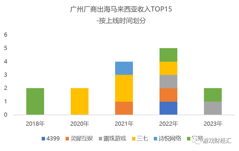 从上线时间来看,广州厂商出海新加坡和马来西亚收入TOP15,2022年及以后上线的产品占比在半数以上。