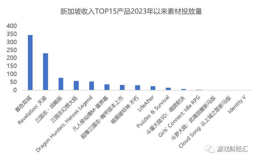 从投放素材数来看,广州厂商出海新马地区收入榜TOP15整体投放量偏低。露珠游戏《暮色双城》、网易《天谕》两款MMORPG新游投放量位居TOP2。