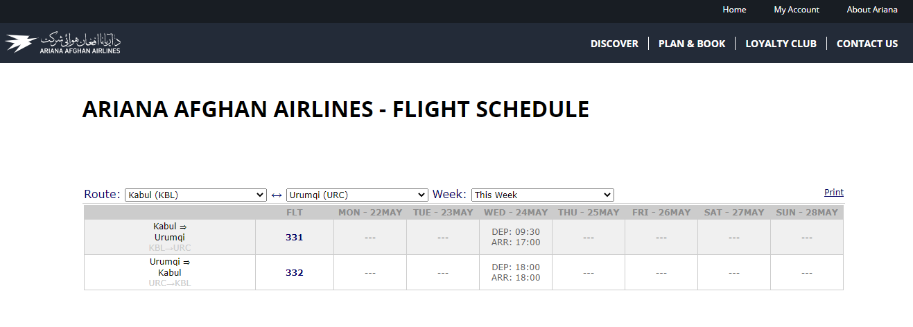 中国民用航空局国际定期客运航班预先飞行计划和阿富汗阿里亚纳航空公司航班计划显示,5月24日(周三)起,阿里亚纳航空将开通乌鲁木齐-喀布尔航线,每周一对航班。
