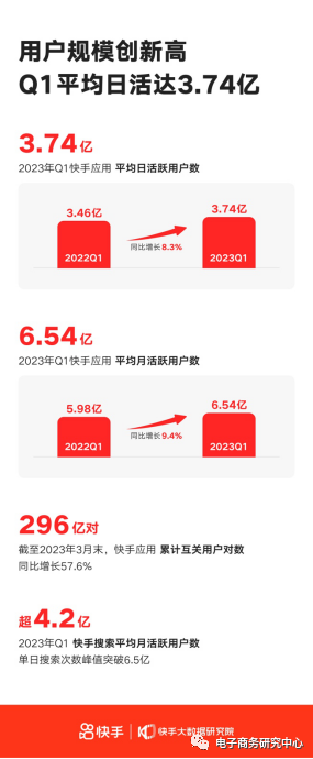 用户生态方面,今年一季度,快手平均日活跃用户同比增长8.3%达3.743亿,平均月活跃用户同比增长9.4%达6.54亿。但慢于2022同期的15.0%的日活增速和17.3%的月活增速。