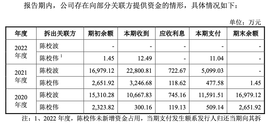 更加值得关注的是,报告期内公司的资金被实控人陈校波及其弟弟陈校伟占用,拆出的资金主要用于陈校波及其家庭成员的房屋购置、家庭消费、投资支出等。报告期内合计拆出金额1.77亿元,其中包括配合银行存款要求进行的资金往来金额合计9900万元,而陈校波、陈校伟偿还的资金来源系公司分红款及家庭自有资金。