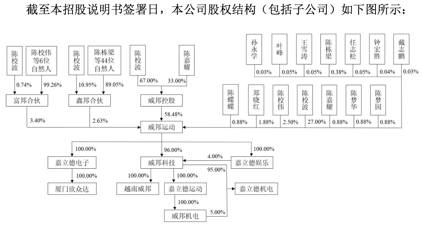 目前,威邦运动的实际控制人为陈校波,其直接持有公司27.00%的股权,通过其控制的威邦控股间接控制公司58.48%的股权,还通过其控制的鑫邦合伙、富邦合伙间接控制公司2.63%、3.40%的股权,因此陈校波合计控制公司91.50%的股权。