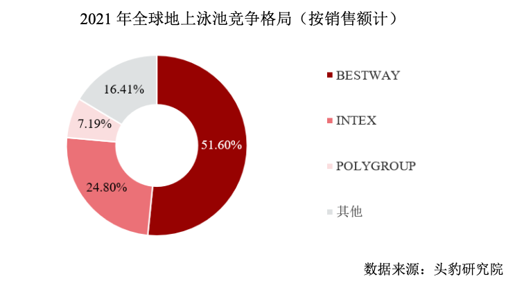 头豹研究院数据显示,全球地上泳池市场主要由BESTWAY、INTEX两家头部企业主导。2021年,两家企业占据约75%的市场份额达到12.87亿美元,行业集中度较高。