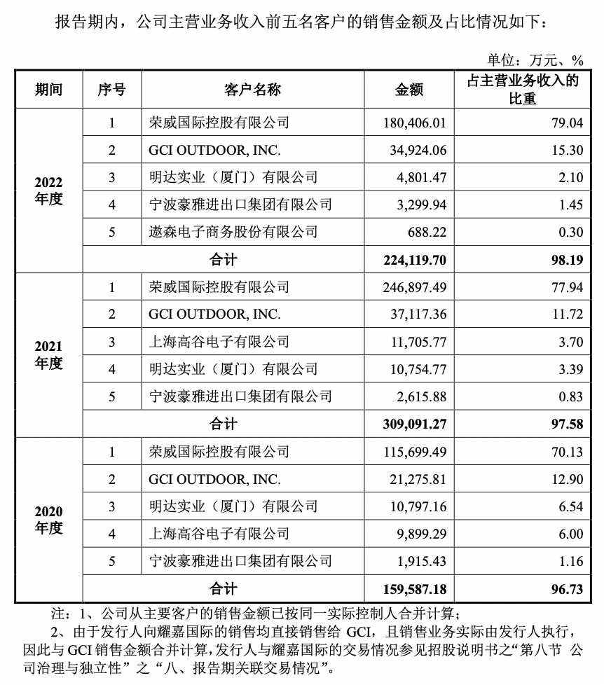 界面新闻注意到,公司的下游客户高度集中,主要客户包括荣威国际、明达实业、GCI等知名企业。报告期内,前五名客户销售收入占主营业务收入的比例分别为96.73%、97.58%和98.19%,其中对第一大客户荣威国际的销售占比分别为70.13%、77.94%和79.04%,主要与下游行业寡头竞争有关。