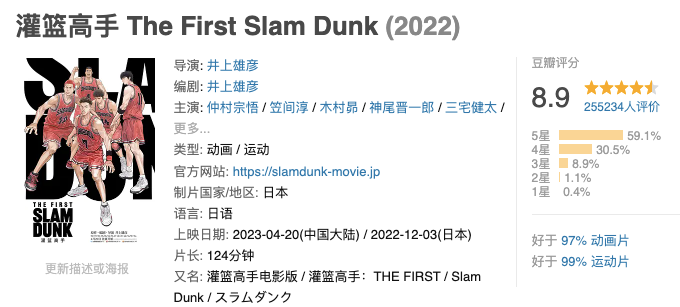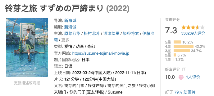 还有口碑,国内很多影视行业的评论者言必称的口碑,大概首先就是“豆瓣评分”,可是,口碑是很多元和个体化的体验,豆瓣评分虽然很有代表性,但并不代表绝对性——《灌篮高手》的豆瓣评分一度破9,现在也高达8.9.远远高于《铃芽之旅》的7.3,可这只代表着喜欢电影版《灌篮高手》的网友们,更喜欢在豆瓣打分,并不能代表两部影片在更广泛人群的认可度。