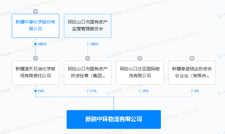天眼查APP显示,新疆中环物流有限公司成立,法定代表人为李永强,注册资本5000万元,经营范围包含:仓储设备租赁服务;供应链管理服务;水产品批发;国内集装箱货物运输代理等。天眼查股权穿透显示,该公司由中泰化学全资子公司新疆蓝天石油化学物流有限责任公司等共同持股。