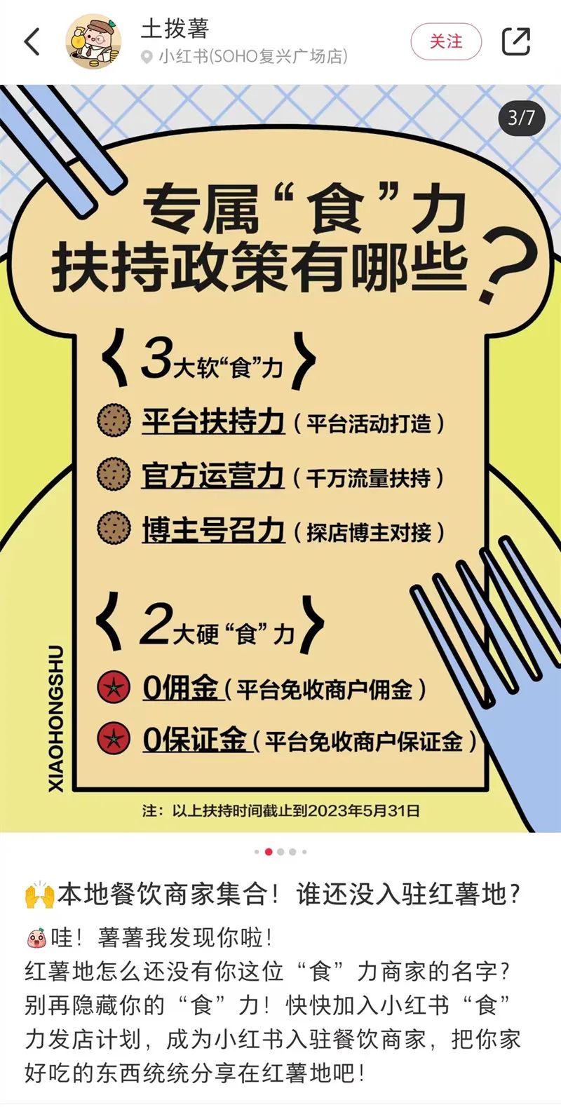 直到今年4月,小红书官方账号土拨薯发布图文剑指本地生活,并通过平台打造系列活动、流量扶持、专属博主对接、免收佣金和保证金等扶持政策来吸引商家入驻。