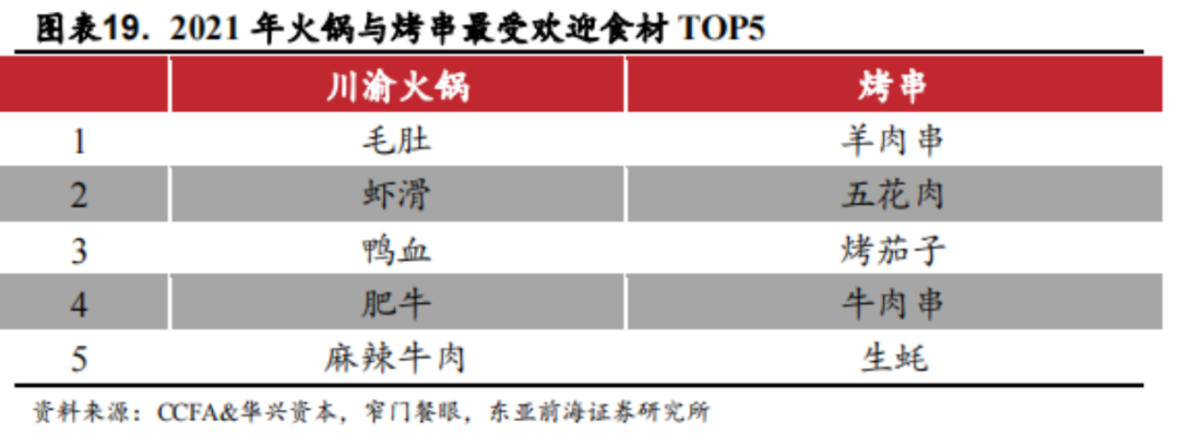 从下表看到,2021年,川渝火锅最受欢迎的食材是毛肚、虾滑、鸭血、肥牛和麻辣牛肉。