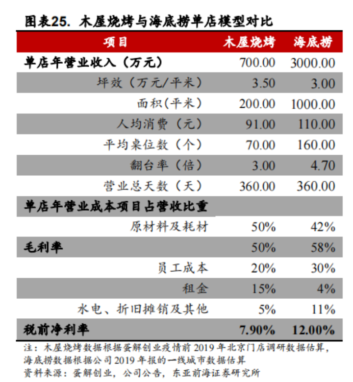我们一起来看下表,对比来看木屋烧烤和海底捞两家店的单店模型。