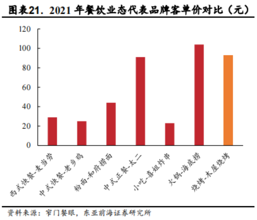 例如2021年,木屋烧烤的客单价是93元,是市场中等水平了,翻台率是3倍。