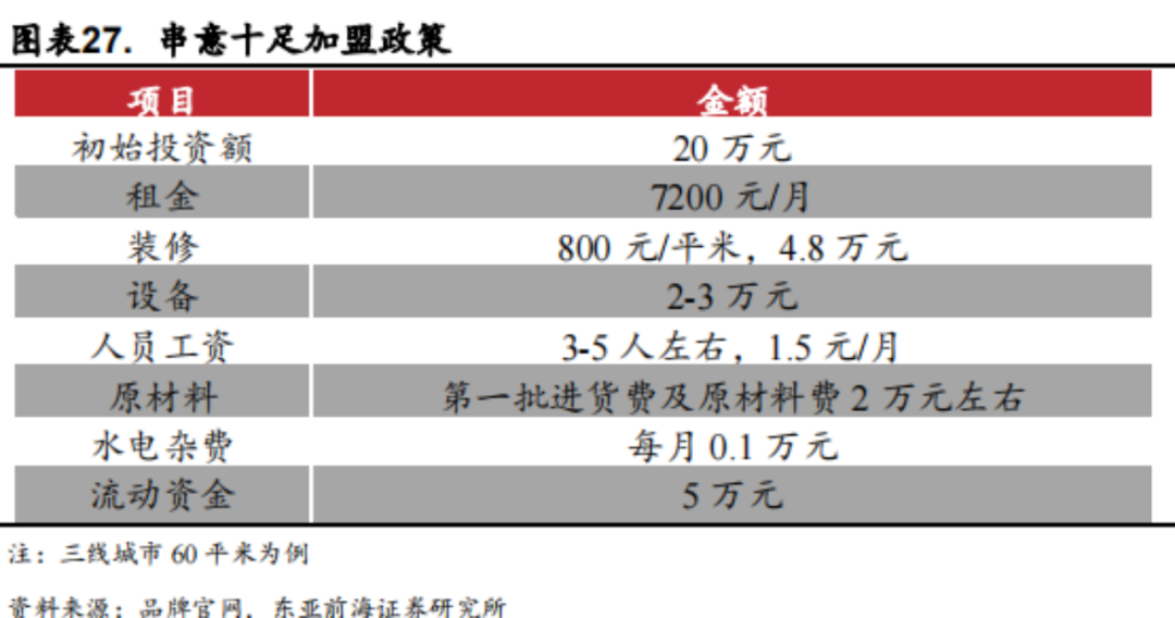 据官网数据,串意十足在三线城市的60平米加盟店,算上人员成本、租金、原材料、水电等支出,整体投资额在20万上下。